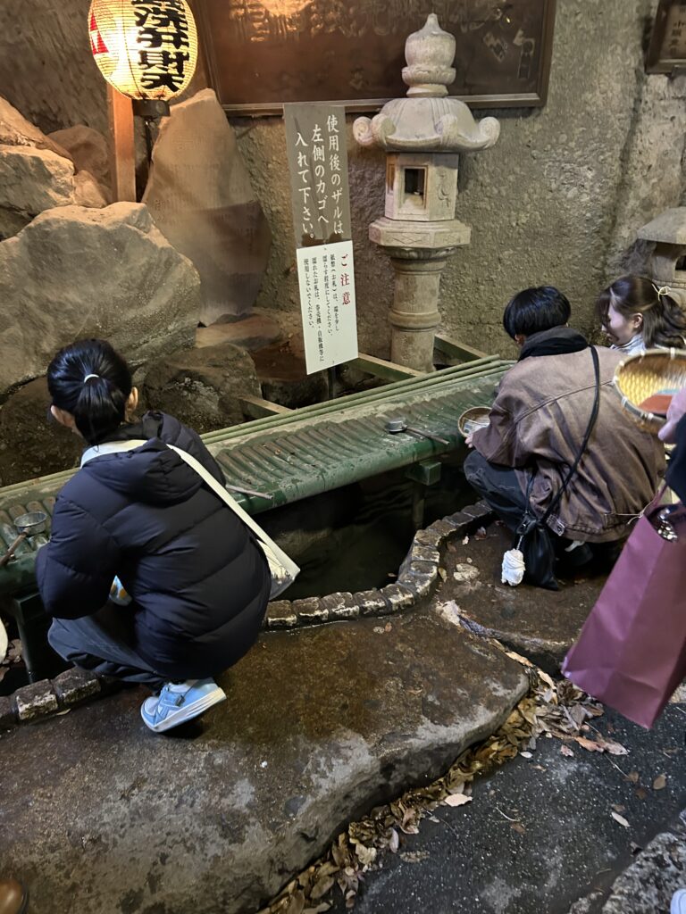 お金が増えるで有名な人気スポット神社。 参拝者がざるにお金を入れ、湧き水で清めます。