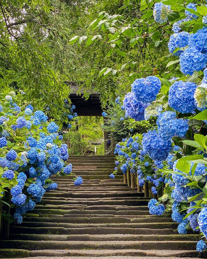 円覚寺を後にして線路沿いを8分程、歩を進め 拝観料500円です。 アジサイ寺です。2500本植えられています。青の参道です。 青いアジサイの色「あじさいブルー・明月院ブルー」が有名です。