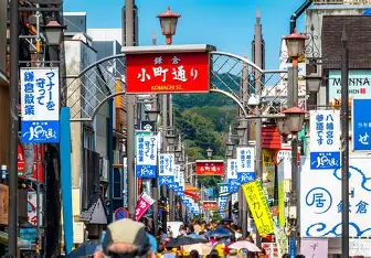 参拝後、本殿から由比ガ浜の海や街並みを見渡しましょう。 晴れた日は心も晴れ晴れです。 軽やかに参拝し後にして近くの小町通りです。